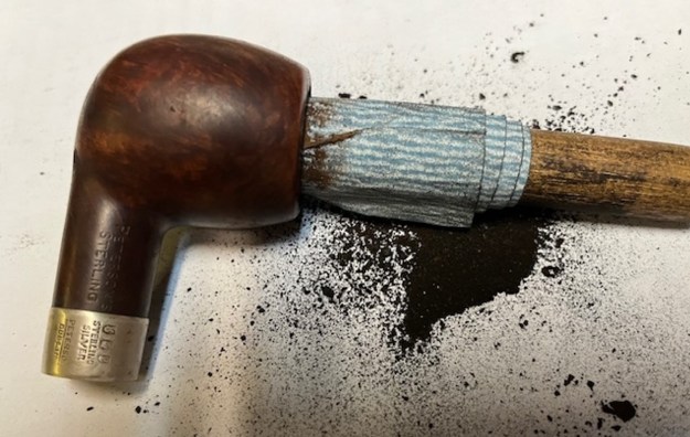 I set the bowl aside and worked on the stem at this point in the process. I filled in the tooth marks on the surface with clear CA glue. Once the repairs cured I smoothed them out with 2 inch sanding pads – dry sanding with 320-3500 grit pads and wiping it down after each pad.