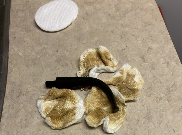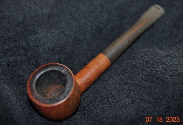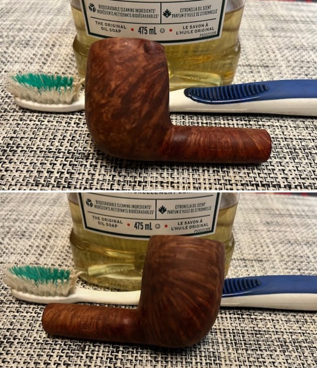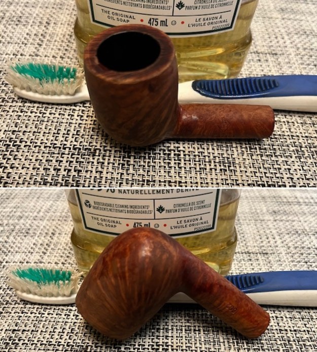 Armed with that information I turned to work on the pipe itself. Jeff had done a great job cleaning up the pipe as usual. He cleaned up the inside of the bowl with a PipNet reamer and a Savinelli Fitsall Pipe Knife. The bowl walls looked very good. He scrubbed the interior of the bowl and shank with pipe cleaners, cotton swabs and alcohol to remove the tars and oils. He scrubbed the exterior of the pipe with Murphy’s Oil Soap and a tooth brush to remove the grime from the finish. He worked on the rim top lava and darkening with the soap and tooth brush. He scrubbed the inside of the stem with alcohol and pipe cleaners. He scrubbed the exterior with Soft Scrub and then soaked it in Briarville’s Pipe Stem Deoxidizer. He washed it off with warm water to remove the deoxidizer. The pipe looked far better. I took photos of the pipe when I received it before I started working on it.