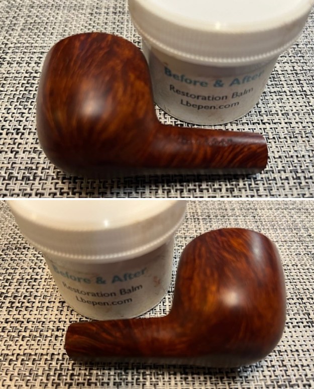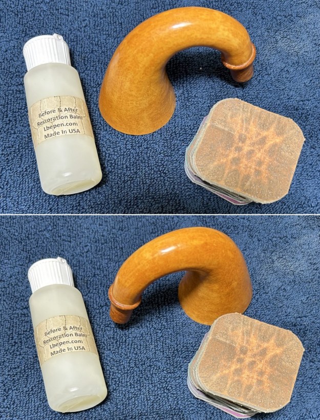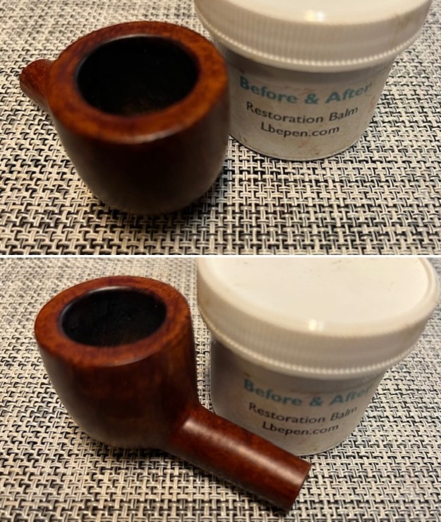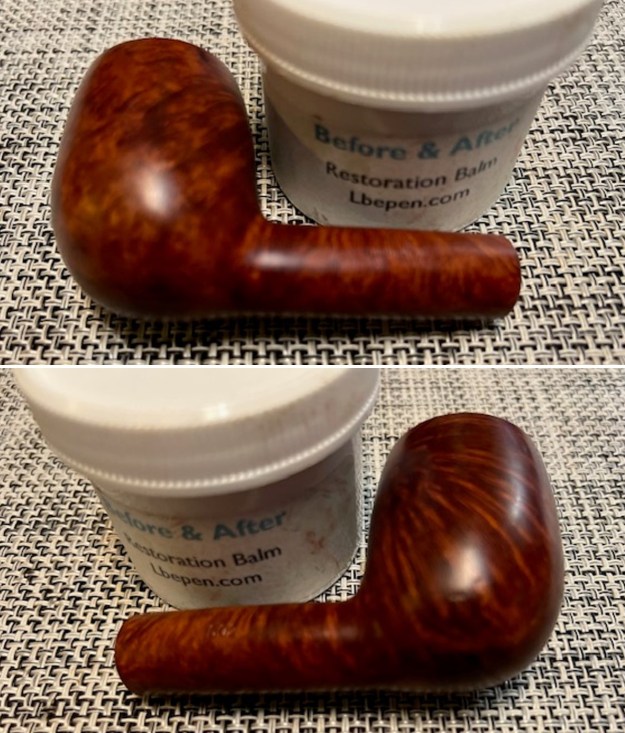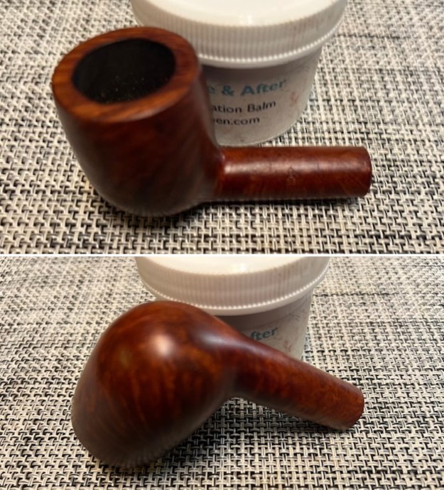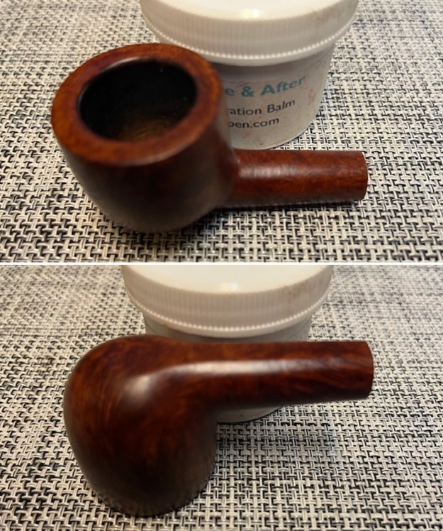 I rubbed the bowl down with Before & After Restoration Balm. I worked it into the surface of the briar with my fingertips and a horsehair shoe brush to clean, enliven and protect it. I let the balm sit for 10 minutes and then buffed with a cotton cloth and shoe brush to raise the shine. Mark Hoover’s Balm is a product that I have come to appreciate and one I use on every pipe I have been working on.