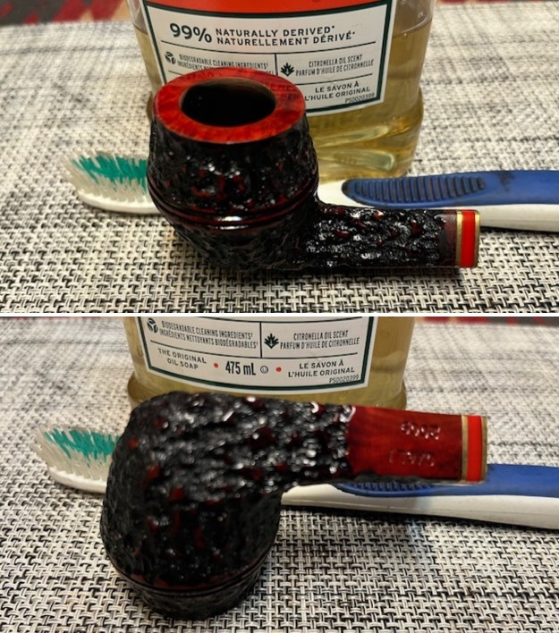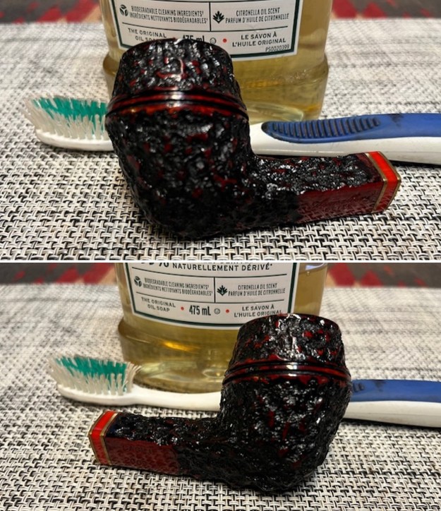 I scrubbed the exterior of the pipe with Murphy’s Oil Soap and a tooth brush to remove the grime from the finish. I worked on the rim top and edge to try to remove the grime and was able to remove it.