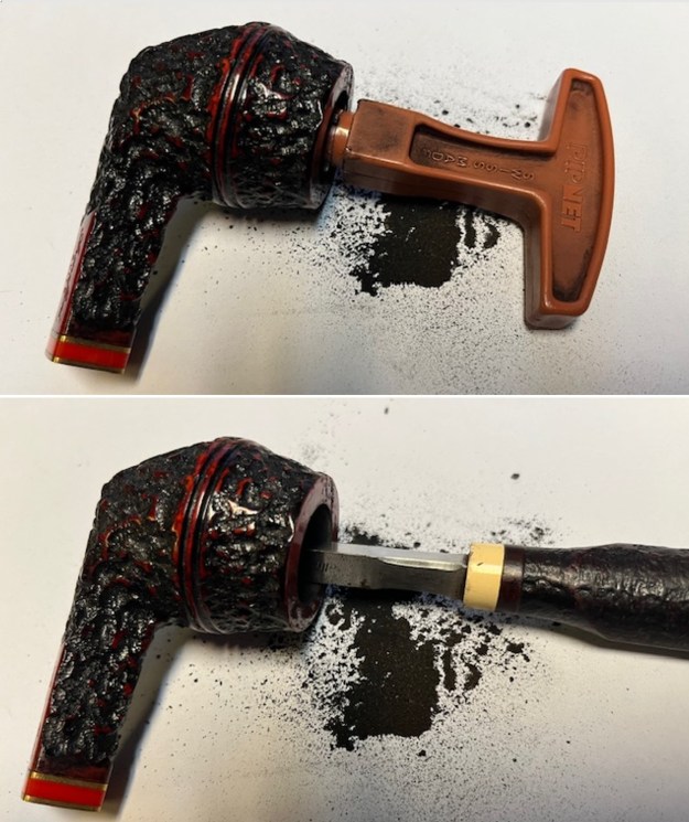 Now, on to the restoration of this beautifully rusticated Armellini Elite Bulldog. I began the work by reaming the pipe with a PipNet reamer and cut back the cake back to the bare briar. I scraped out what remained with a Savinelli Fitsall Pipe Knife. I sanded the walls of the bowl with a piece of dowel wrapped with 220 grit sandpaper to smooth the out. The walls looked to be in excellent condition with no checking or heat damage.