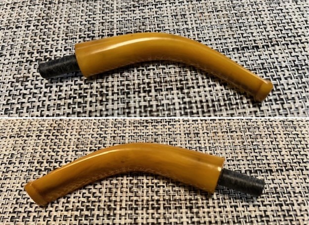 This Pioneer Bent Billiard Meerschaum is finally finished. There were points in the process that I really wondered if I had bit off more than I could chew. It was a painful process to see the bone tenon that had been glued in slowly – and I mean very s l o w l y take shape and open the mortise to receive a the new tenon. The pipe has a rich patina on the shank and developing up the bowl sides. The polished acrylic taper stem adds to the mix. I put the stem back on the bowl and hand buffed the pipe with polish on a soft cloth. I did not want to chance damaging it on the wheel. I gave the bowl and the stem multiple coats of Clapham’s Beeswax and buffed it with a clean microfiber cloth to raise the shine. The finished Pioneer Meerschaum Bent Billiard is quite nice and feels great in the hand. Give the finished pipe a look in the photos below. The dimensions of the pipe are Length: 5 inches, Height: 1 ½ inches, Outside diameter of the bowl: 1 1/8 inches, Chamber diameter: ¾ of an inch. The weight of the pipe is .99 ounces/28 grams. Thanks for walking through the restoration with me as I worked over this challenging meerschaum pipe. I am going to call the pipeman who owns it later today as I know he is excited to see it. Thanks for your time.