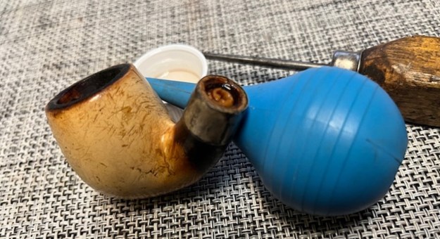 While I was travelling in Nepal I was contacted by a fellow here in Vancouver about restoring a pipe that had originally belonged to his grandfather. We planned on getting together once I was home. I called and within a few hours he was at the door with the pipe. We are dog sitting my daughter’s dog Frank and he rang the alarm to let us know someone was at the door. I met him on the porch and looked over the pipe. He lovingly took it out of his pocket and showed me the hard case in his hands. It was a good looking black hard case that was in good condition with a few wear marks on the surface. Little did I know what I was getting into with this restoration.