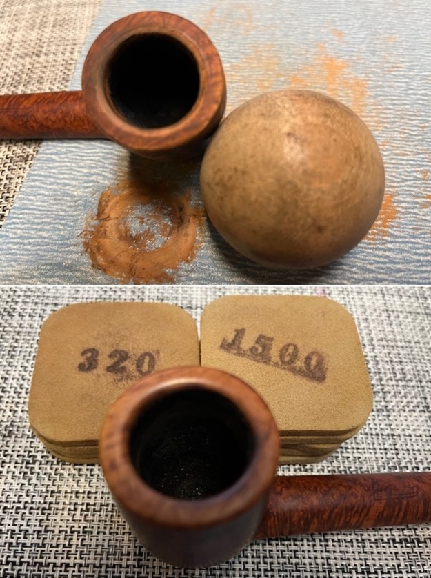 I started my work on the pipe by addressing the damage on the inner edge of the rim. I used a folded piece of 220 grit sandpaper to smooth out the roughness. I then used 220 grit sandpaper and a wooden ball to give the inner edge of the bowl a slight bevel. It looked much better at this point in the process.