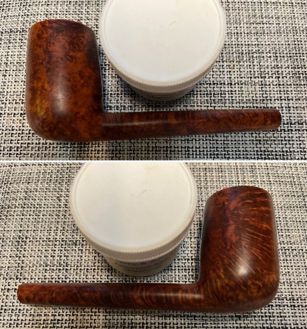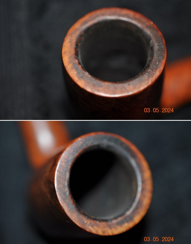 Armed with that information I turned to work on the pipe itself. Jeff had done a great job cleaning up the pipe as usual. He cleaned up the inside of the bowl with a PipNet reamer and a Savinelli Fitsall Pipe Knife. The bowl walls looked very good. He scrubbed the interior of the bowl and shank with pipe cleaners, cotton swabs and alcohol to remove the tars and oils. He scrubbed the exterior of the pipe with Murphy’s Oil Soap and a tooth brush to remove the grime from the finish. He worked on the rim top lava and darkening with the soap and tooth brush. He scrubbed the inside of the stem with alcohol and pipe cleaners. He scrubbed the exterior with Soft Scrub and then soaked it in Briarville’s Pipe Stem Deoxidizer. He washed it off with warm water to remove the deoxidizer. The pipe looked far better. I took photos of the pipe when I received it before I started working on it.