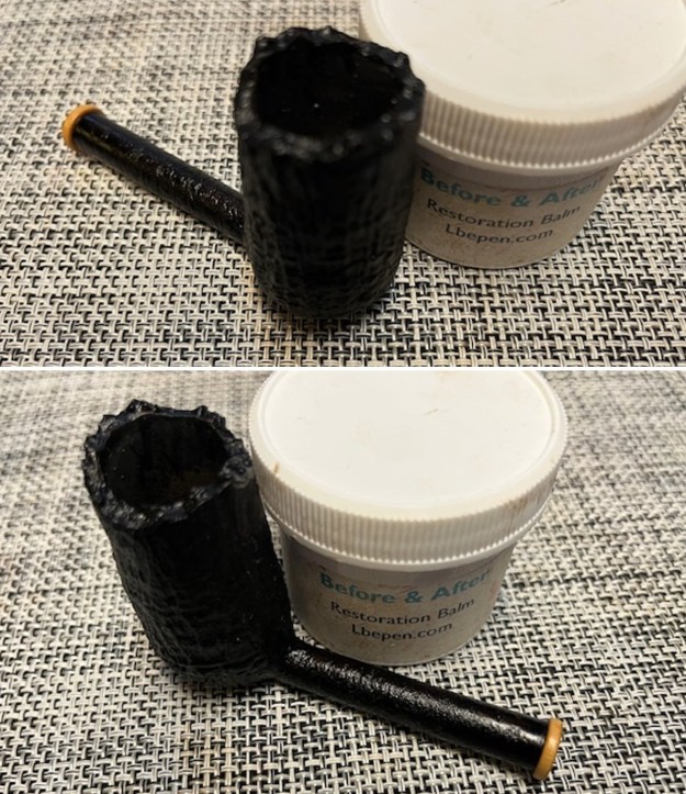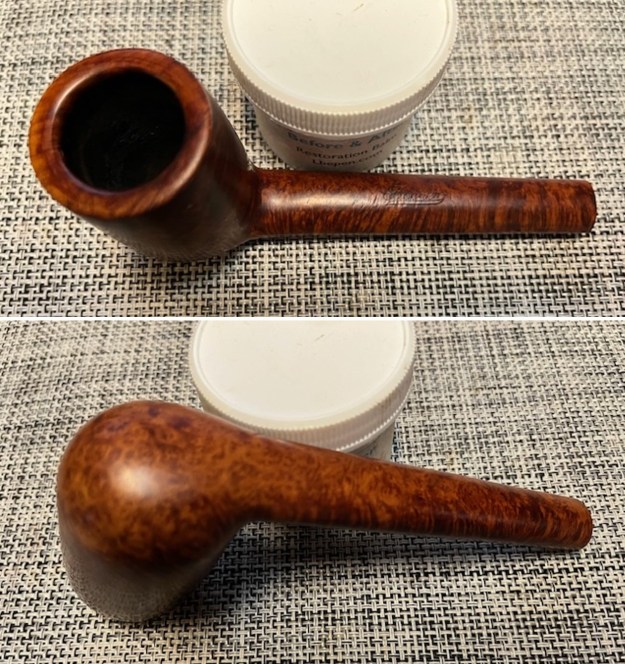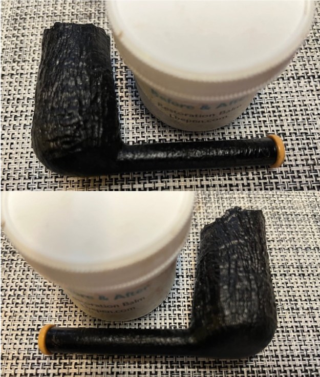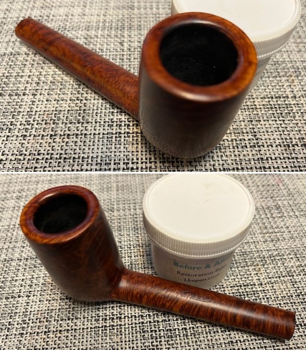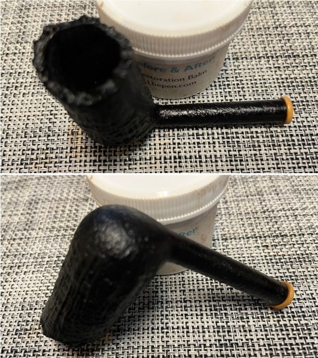 I rubbed the bowl down with Before & After Restoration Balm. I worked it into the surface of the briar with my fingertips and a horsehair shoe brush to clean, enliven and protect it. I let the balm sit for 10 minutes and then buffed with a cotton cloth and shoe brush to raise the shine. Mark Hoover’s Balm is a product that I have come to appreciate and one I use on every pipe I have been working on.