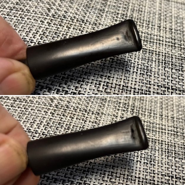 I set aside the bowl and turned my attention to the stem issues. I took photos of the stem surface to show the deep tooth marks on the top and the small holes on the underside of the stem just ahead of the button.