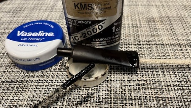 I greased a pipe cleaner with Vaseline and inserted it below the bite throughs on the underside of the stem surface to keep the repair out of the airway in the stem. I filled in the deep tooth marks on the topside of the stem and the bite throughs on the underside with Black rubberized CA glue. I set it aside to let the glue cure.