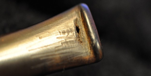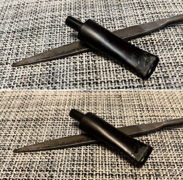Once the repairs cured I used a file to flatten out the repairs and start blending them into the stem. surface. I sanded it with a folded piece of 220 grit sandpaper to flatten it further.