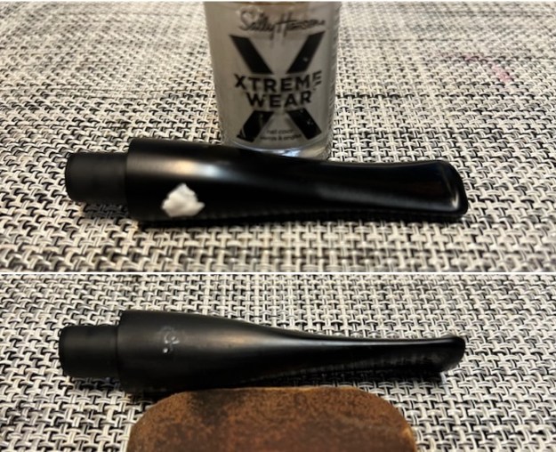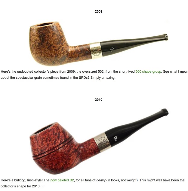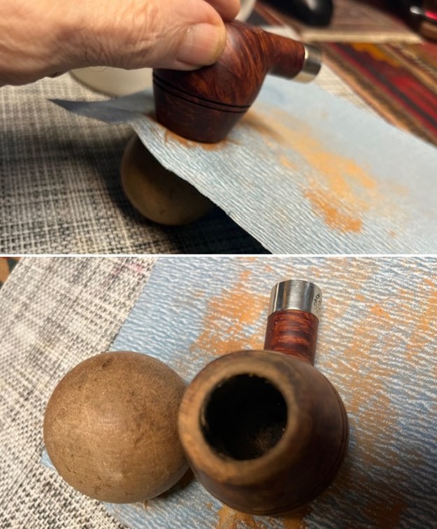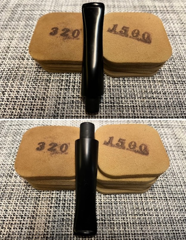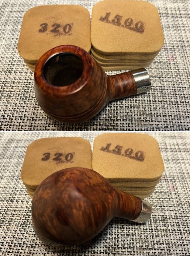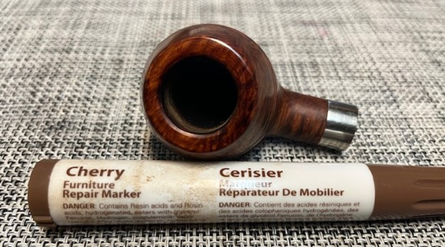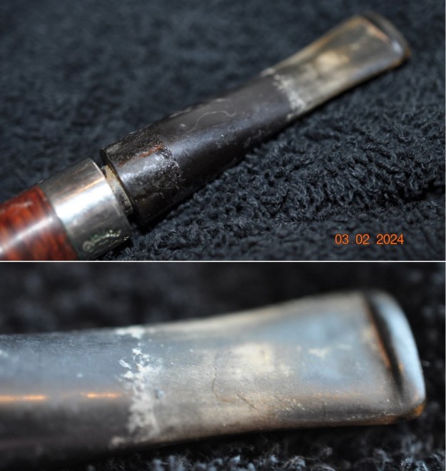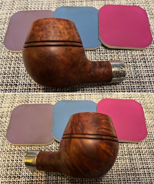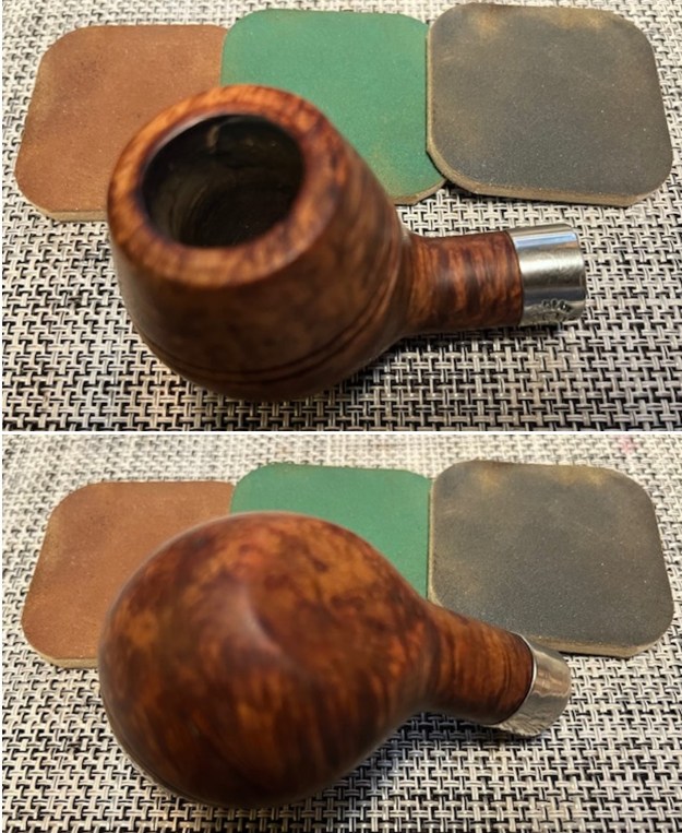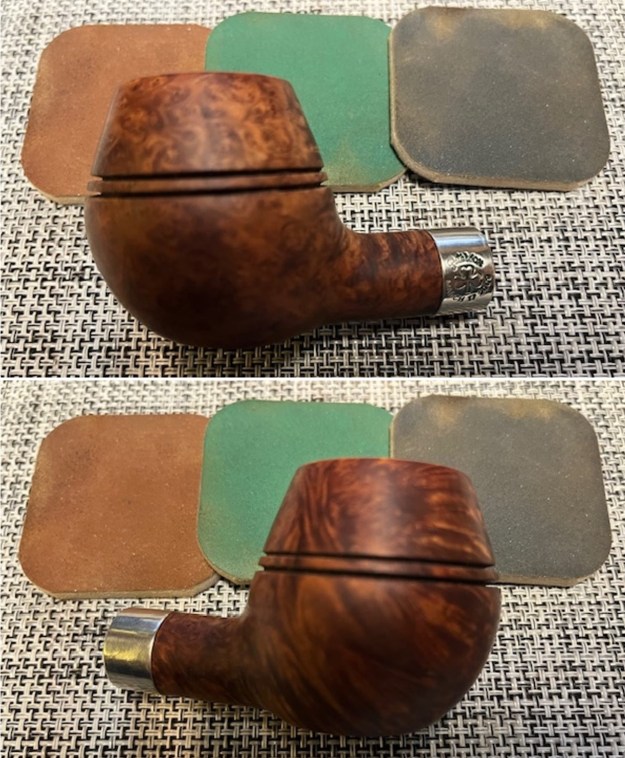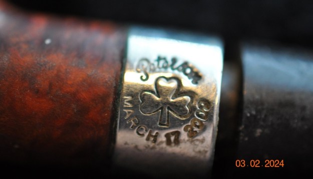 Jeff went to the house and looked through the racks, pipe bags, tobacco – both bulk and tinned as well as a variety of pipes. All the pipes were well smoked and needed serious cleaning. Another one of the pipes that he picked up was this Peterson March 17 2009 with a black vulcanite taper fish tail stem. It was very dirty and was a reddish, brown coloured pipe when it started. The smooth finish around the bowl was dirty and had hand oils ground into the grooves. The bowl had a thick cake that overflowed in lava onto the rim edge and top of the bowl. The bottom of the bowl was flattened so the pipe could be set on a desktop. The stem was vulcanite that was very dirty and had the marks of a rubber Softee Bit on the end. It had become discoloured and there was a line where the debris from smoking had accumulated along the edge and under the bit protector. The good news was that there were only light tooth marks or chatter. The rest of the stem was dirty and had lost the characteristic shine. The pipe was stamped on the polished nickel band on the shank and read Peterson [arched over] a Shamrock with March 17 2009 arched underneath. On the right side of the shank it was stamped with the shape number B2. Jeff took photos of the pipe so I could have a sense of what it looked like before he started his work on it.Jeff took photos of the stem surfaces and the bowl and rim to give a sense of condition of the pipe. You can see the thick cake in bowl and the lava overflow on the edges and rim top of the bowl. It is had to know if there is any damage as the cake and lava is quite thick. The stem surface is very dirty and you can see the area on the end of the stem where the Softee Bit had protected it from chewing but had left it dirty and discoloured. The stem no longer fit in the shank correctly. He also took photos of the sides of the bowl and the heel to show the interesting grain that went around the bowl. There were a few spots on the right side of the bowl that seemed to have a flaw or a shrunken fill. The grain is beautiful and you can see the oils and debris in the grooves of the rim cap.  He took photos of the stamping on the nickel band on the left side of the shank. He did not capture shape number on the right side. The stamping on the band is clear and readable as noted above.I did a bit of searching on the internet to see what I could find. Interestingly turning to Peterson’s Pipe Notes I found the pipe I have in my hand (https://petersonpipenotes.org/tag/st-patricks-day-pipe-2009/). Note that in Mark Irwin’s information below the date he gives for the shape I have is 2010 but the band on mine is definitely marked 2009. Ah well another Peterson anomaly. Either way it is a nicely shape Irish Bulldog.Now it was my turn to work on the pipe. Jeff had done an amazing cleanup of the pipe. He reamed the light cake with a PipNet reamer and cleaned up that with a Savinelli Fitsall Pipe Knife. He scrubbed the internals of the bowl and stem with alcohol, cotton swabs and pipe cleaners. He scrubbed the externals with undiluted Murphy’s Oil Soap and rinsed the bowl off with running water. He soaked the stem in Briarville’s Pipe stem Deoxidizer and once it had soaked rinsed it off with warm water to remove the residual solution. He dried it off and rubbed it down to remove any oxidation that was still on the stem. The pipe looked very good when I received it. I took a photo of the rim top to show the condition. You can see the clean bowl. The bowl is in excellent condition and is clean. The rim top has a small burn mark on the front inner edge and darkening on the back of the rim top and edges. The stem came out looking good. There were definitely light tooth marks and chatter on both sides. I took a photo of the stamping on the shank. The first photo shows that there is no stamping on the briar but the nickel band stamp is very clear. The shape number, B2 on the right side of the shank is also very clear. There was a faint remnant of the P stamp on the left side of the stem.  I removed the stem from the shank and took a photo of the pipe parts to show what I was working with. I also took photos of the pipe with the longer Churchwarden stem in place. It is a nice looking pipe. I started my work on the pipe by addressing the damage on the inner edge of the rim. I used a folded piece of 220 grit sandpaper to smooth out the roughness. I then used 220 grit sandpaper and a wooden ball to give the inner edge of the bowl a slight bevel. It looked much better at this point in the process. I touched up the stain on the rim top with a Cherry Stain Pen and the match to the rest of the bowl is perfect. Once the bowl is finished it will blend very well.I sanded the briar rim top and the sides of the bowl with 320-3500 grit sanding pads. I wiped the bowl down with a damp cloth after each pad. By the time I finished with the 3500 grit pad the briar had taken on a rich glow. The pipe had cleaned up so well that I turned to polish the briar with micromesh sanding pads. I dry sanded it with 1500-12000 grit sanding pads and wiped the bowl down after each pad with a damp cloth. By the final pads the briar really had a shine. I rubbed the briar down with Before & After Restoration Balm. I worked it into the briar with my fingertips and a horsehair shoe brush to work it into the nooks and crannies of the sandblast finish. The product works to clean, enliven and preserve the briar. I let it sit for 10 minutes then I buffed it with a cotton cloth to deepen the shine. The pipe really comes alive with the balm. I set aside the bowl and turned my attention to the stem. I “painted” the stem surface with the flame of a lighter. I was able to lift the tooth marks significantly. Those that remained were more like waves in the stem surface. I filled them in with a coat of clear CA glue and spread it across the surface with a dental spatula. Once the repairs cured I sanded it with a folded piece of 220 grit sandpape