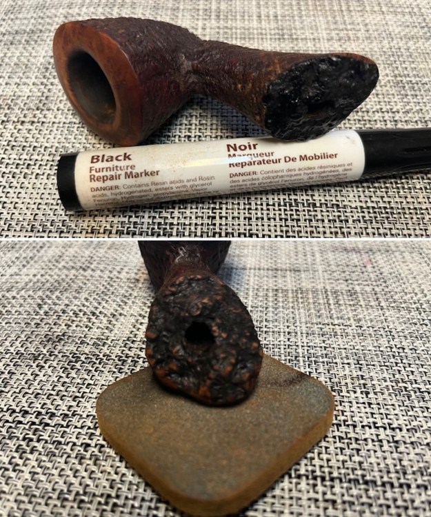 I set aside the bowl and turned my attention to the stem. I “painted” the stem surface with the flame of a lighter. I was able to lift the tooth marks significantly. There were still some deep marks. I filled them in with a coat of clear CA glue and spread it across the surface with a dental spatula.