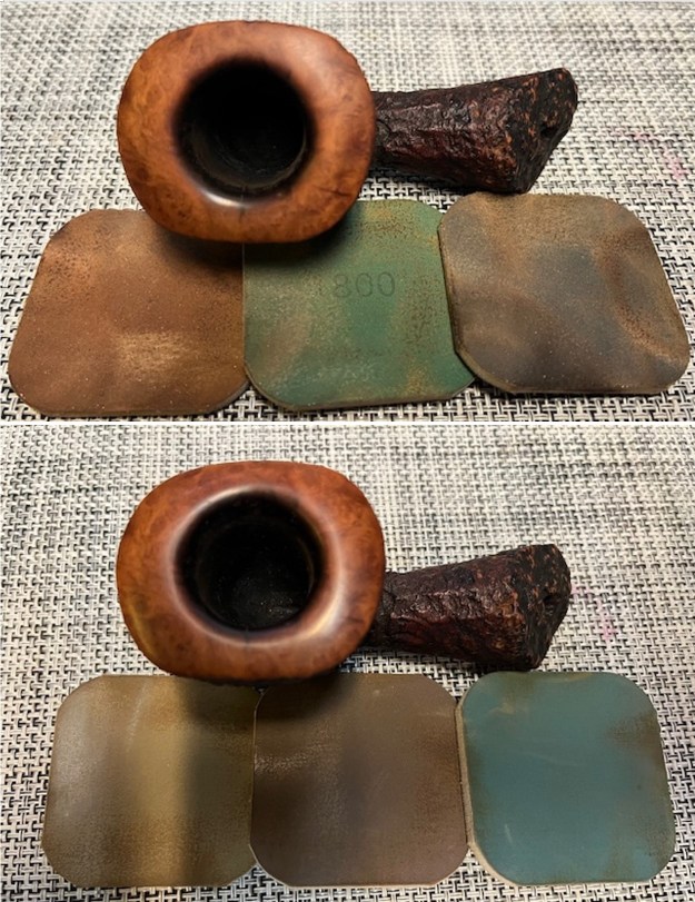 I sanded the briar rim top and the sides of the bowl with 320-3500 grit sanding pads. I wiped the bowl down with a damp cloth after each pad. By the time I finished with the 3500 grit pad the briar had taken on a rich glow.