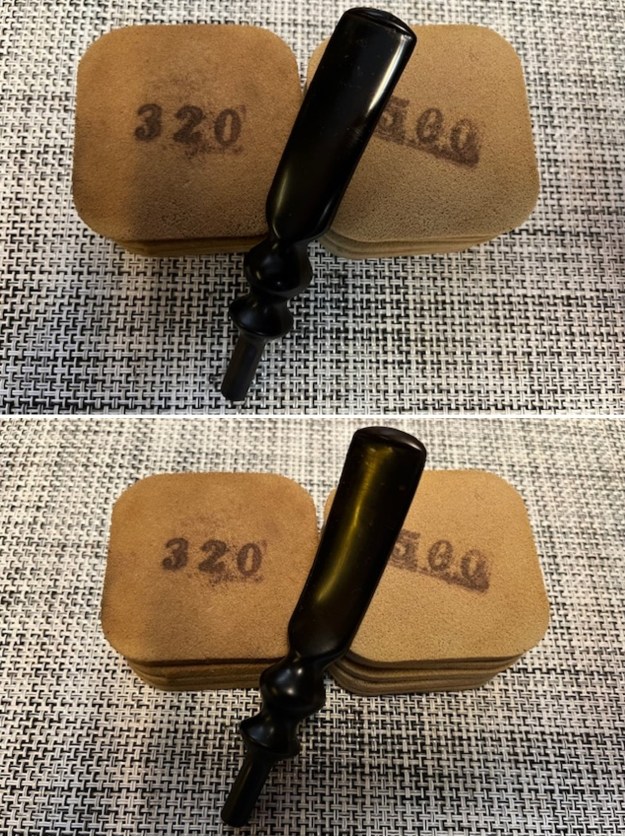 I moved on to further smooth out the surface of the vulcanite. I sanded it smooth with 320-3500 grit sanding pads to further blend them into the surface of the stem.