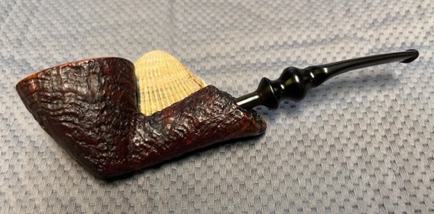 The next pipe on the table is a rugged, sandblast Freehand with a smooth rim and plateau shank end. It had a fancy, turned saddle vulcanite stem. We purchased it from a seller on eBay from Jordan, Minnesota, USA on 01/22/2024. The pipe is stamped on the underside of the shank and reads Frasorteret [over] Hand Made [over] In [over] Denmark. The rim was in good condition other than lava overflowing from the thick cake in the bowl onto the smooth rim top. It is hard to assess the condition of the inner edge of the rim due to the cake and lava overflow. There may be some darkening or damage at the back of the bowl but I cannot be sure. There were oils and grime ground into the bowl sides gives the finish a flat look. The fancy saddle stem is dirty, with grime and grit on the surface. There were also tooth marks on both the top and underside of the stem just ahead of the button. Jeff took photos of the pipe before he started his clean up work. I have included them below.
