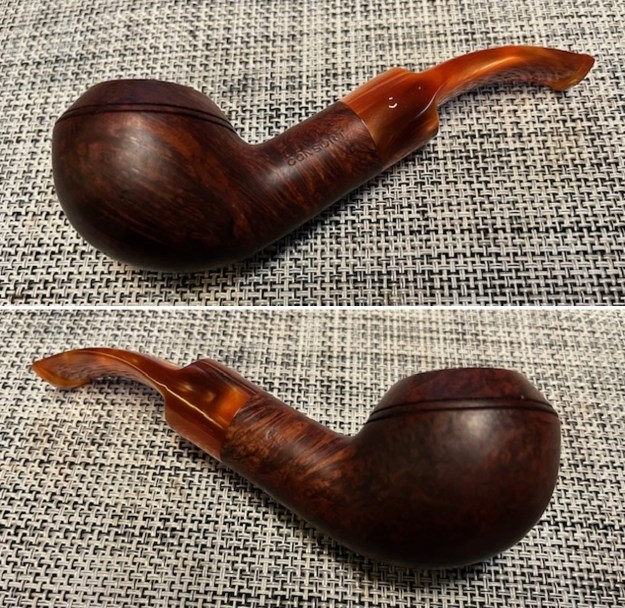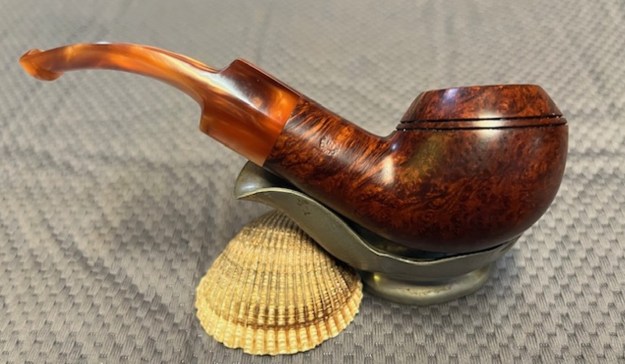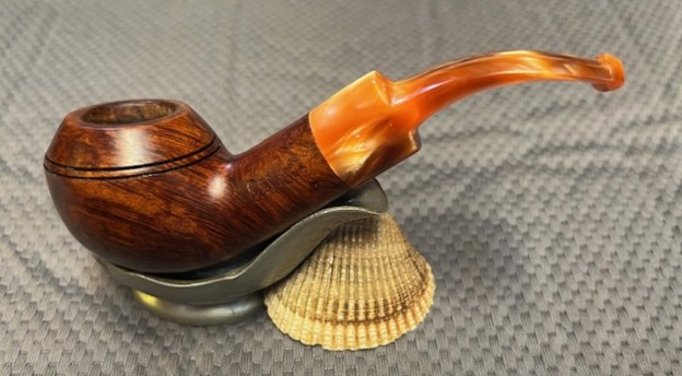 The next pipe on the table is a great looking Bent Rhodesian with great grain around the bowl. It has a well shaped variegated acrylic stem. We purchased it from an estate sale in Spring Branch. Texas, USA on 02/29/2024. I have included the photos below that the seller sent to me so I could see what the pipe looked like.