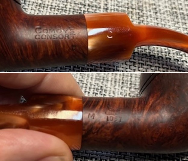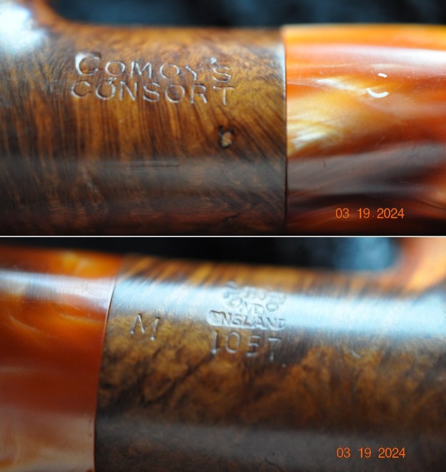 He took photos of the stamping on the sided of the shank. It is clear and quite readable. It reads as noted above. You can also see the decal of the Comoy’s logo on the side of the stem. It is worn off in places but still identifiable.