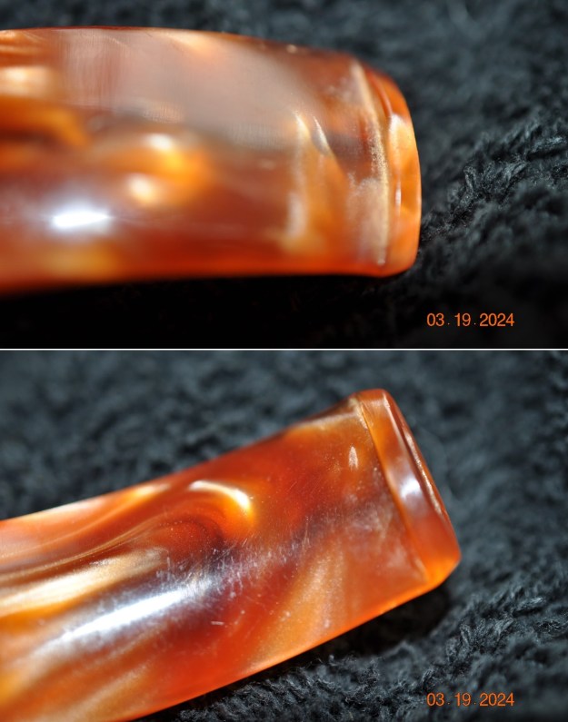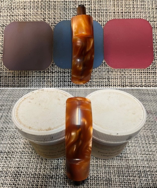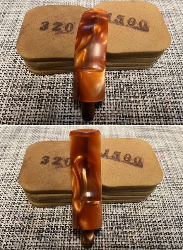 I polished the acrylic with micromesh sanding pads – 1500-12000 grit pads. I wiped it down with a damp cloth after each sanding pad. I used Before & After Pipe Polish – both Fine and Extra Fine to further polish the stem.