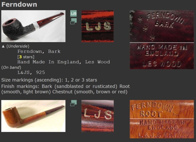 Due to the vagaries of international trademark law, he sold his earlier pipes as ” L.&J.S Briars”, “Ellwood”, “Les Wood” or “L. Wood”. Until recently, an average of 1500 – 2000 pipes a year were sold as “Ferndown” — named for the mansion he lives in — in the UK and US, but as “L. Wood” pipes in Germany…