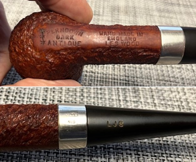 The next pipe on the table is a beautiful rusticated Dublin with a silver band. We purchased it from an estate sale in Oregon City, Oregon, USA on 03/21/2024.The pipe is stamped on a smooth panel on the underside of the shank and reads *** followed by Ferndown [arched over] Bark [over] Antique followed by Hand Made In [over] England [over] Les Wood. There was a thick cake in the bowl with a lava coat around the inner edge and lightly on the top. There was grime ground into the rusticated finish around the bowl and shank. The pipe had been smoked heavily and was someone’s obvious favourite. It was hard to know the condition of the inner edge for certain because of the lava. The oxidized band on the shank is Sterling Silver and bears the stamp L&JS followed by 925 on the left side. There is an LJS logo stamped in gold on the left side of the taper stem. The stem is oxidized and calcified. With a mark left behind on the stem end from a Softee Bit. There appears to be some light tooth chatter on the top and underside of the stem ahead of the button. Jeff took photos of the pipe before he started his clean up work. I have included them below.
