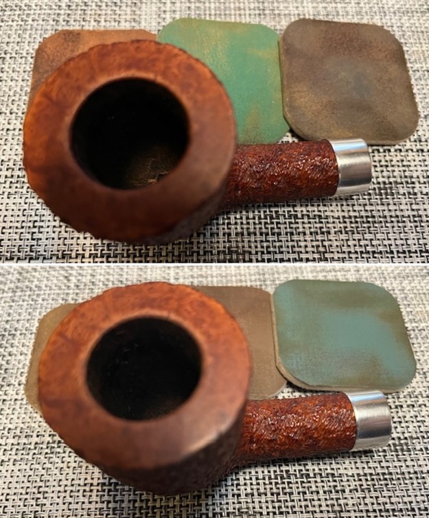 I polished the smooth rim top with micromesh sanding pads. I dry sanded it with 1500-12000 grit sanding pads and wiped the bowl down after each pad with a damp cloth. By the final pads the briar really had a shine.