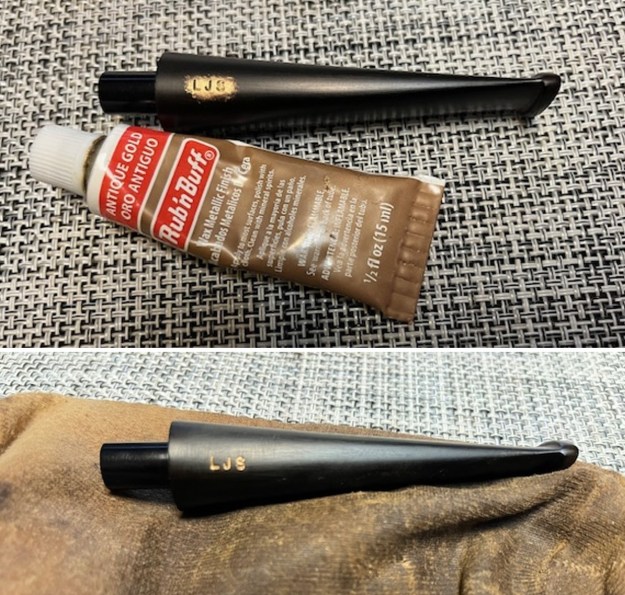 I touched up the LJS stamp on the left side of the taper stem with Rub’n Buff Antique Gold. I rubbed it on and worked it into the stamp with a tooth pick. I buffed it off with a Obsidian Oil cloth. It looks very good.
