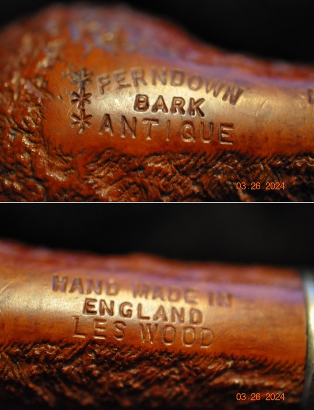 The pipe I am working on is as noted above a Ferndown which identifies it as a pipe named after his mansion and as a pipe made for the UK and the US. It is also as noted in red above stamped Antique Bark which identifies it as a tan rusticated pipe.