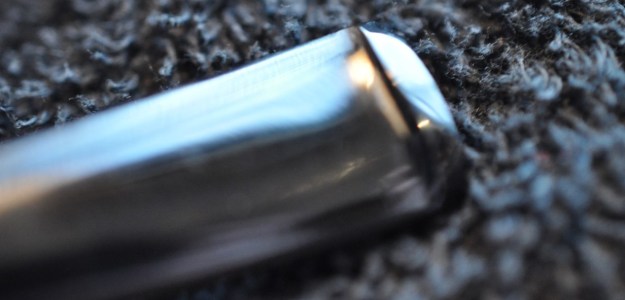 I set the bowl aside and turned to address the stem issues. I recut the edge of the button with a small file. It took a bit of work to sharpen the edge and give it a better transition. I sanded it smooth with 220 grit sandpaper to smooth out the surface.