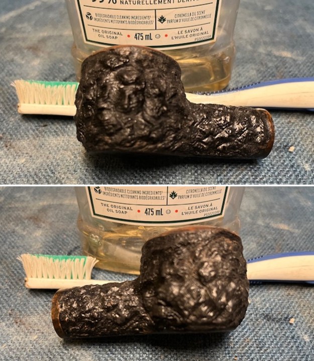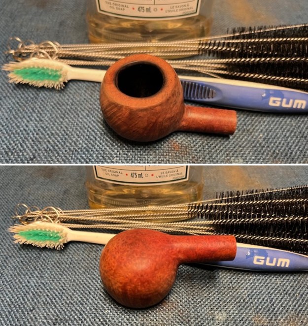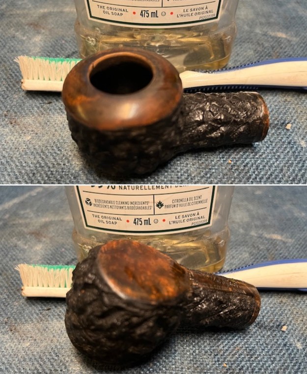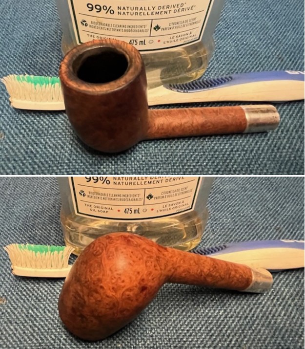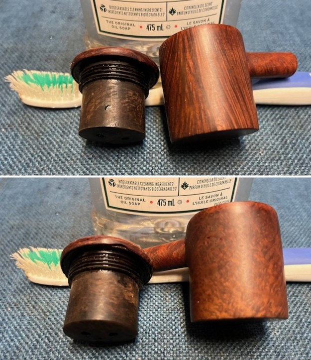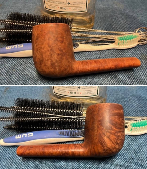 I scrubbed the exterior of the bowl with a tooth brush and undiluted Murphy’s Oil Soap to remove the grime and debris in the finish. I scrubbed out the mortise and tenon with small tube brushes and soap to remove the oils and tars in the shank area. I rinsed it with warm water to remove the grime and oils in the finish and shank. I dried it off with a soft cotton cloth. One of the benefits of doing this is that the briar in the nicks and dents on the bowl sides swell and virtually disappear. The pipe has a fresh look that really highlights the depths of the sandblast on the briar.