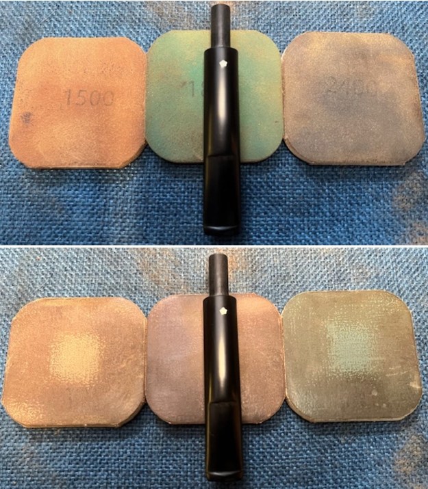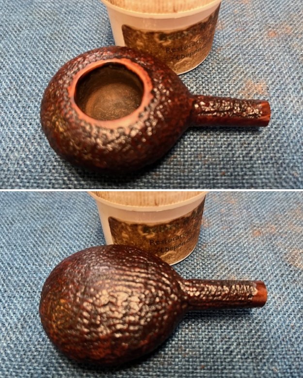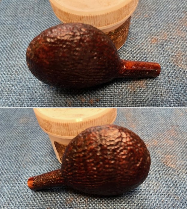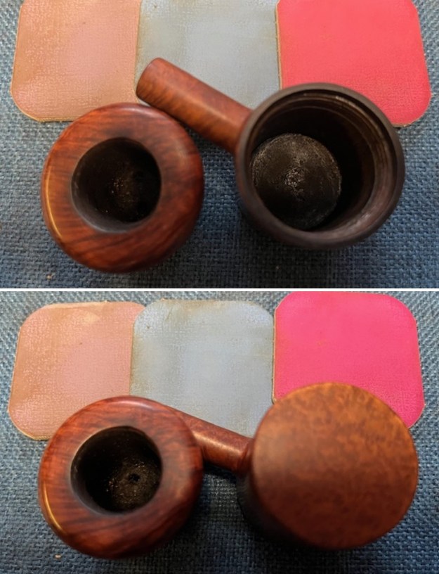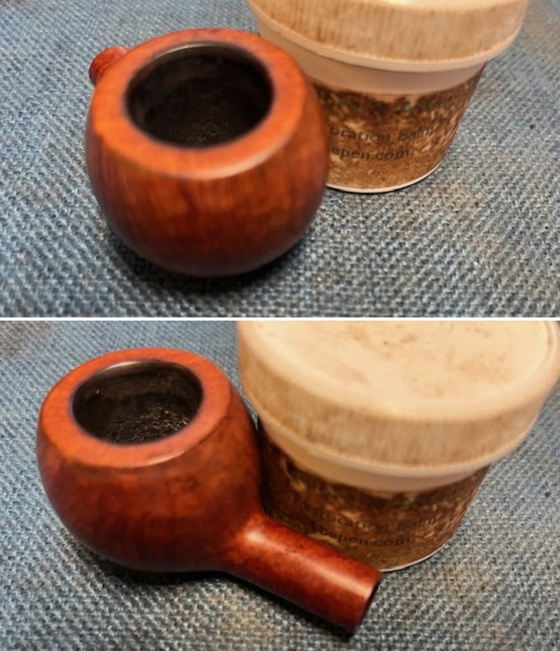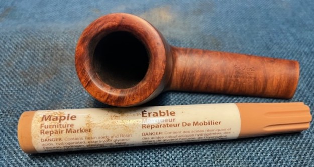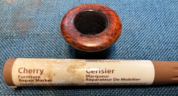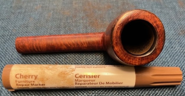 I used a Walnut and a Mahogany stain pen to touch up the fading on the bowl sides. There were spots where the stain had faded and it added to the worn look. I restained it with these two stain pens and then used a black stain pen to touch up the spaces. The combination of the stains is very close to the colour on the Shell Briar. I let it dry and once it did it looked much better.