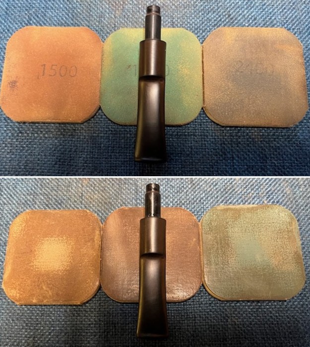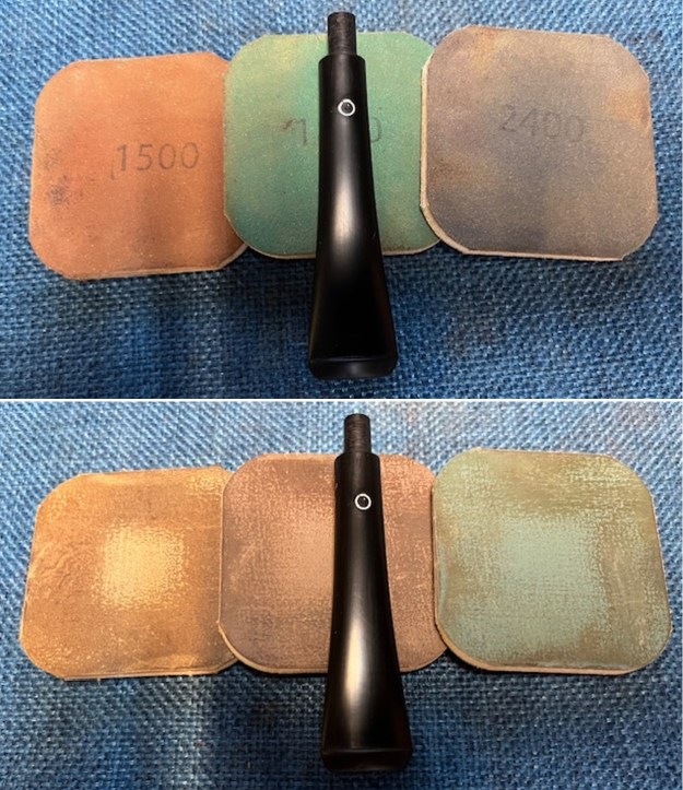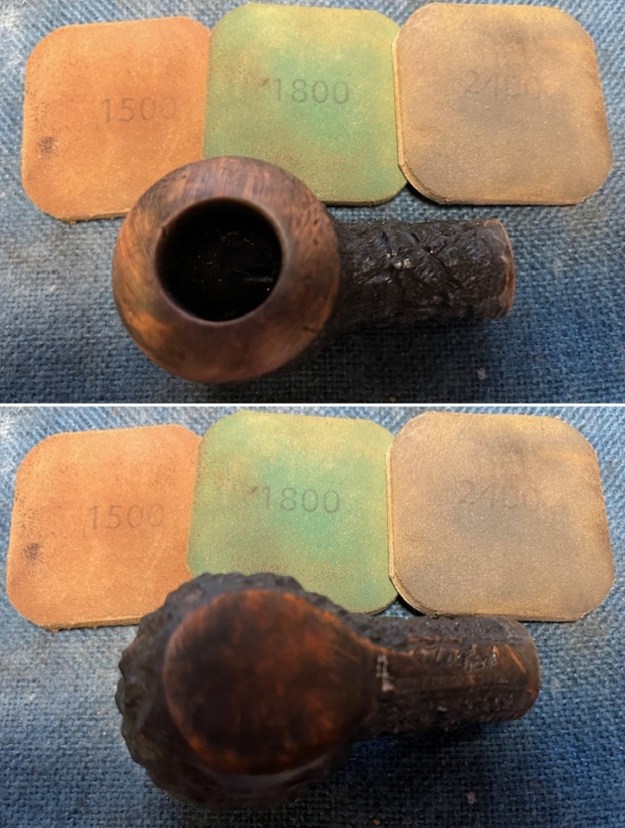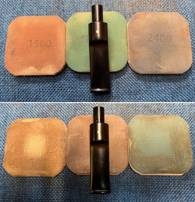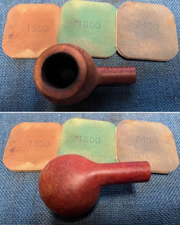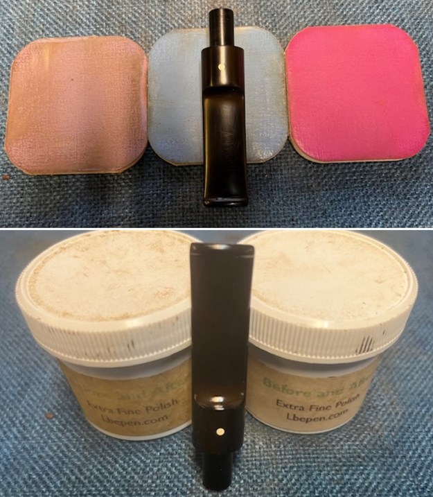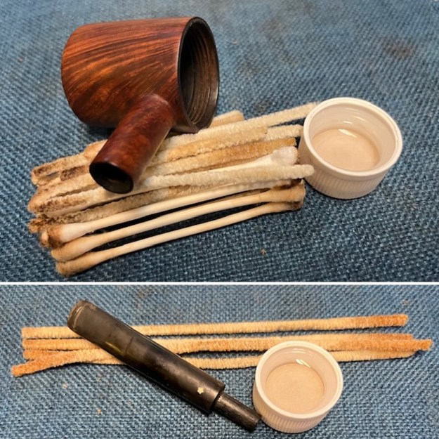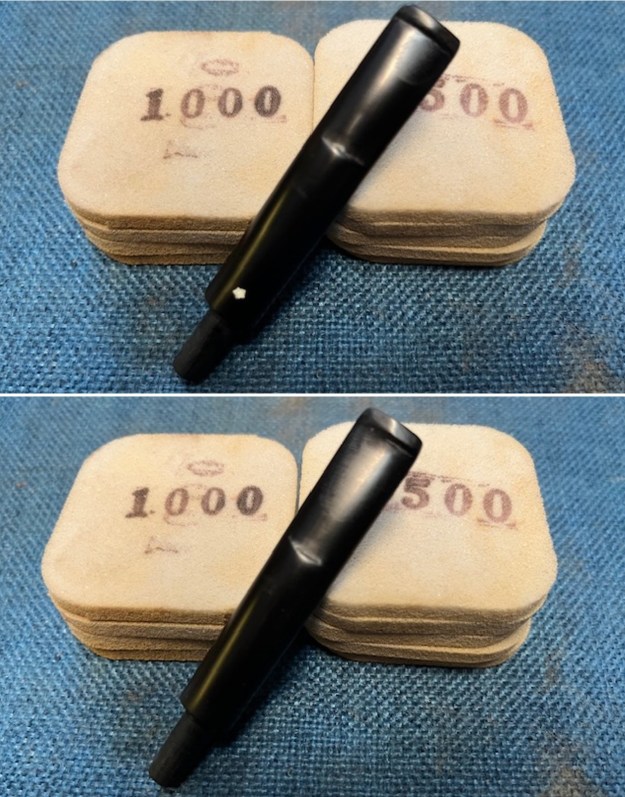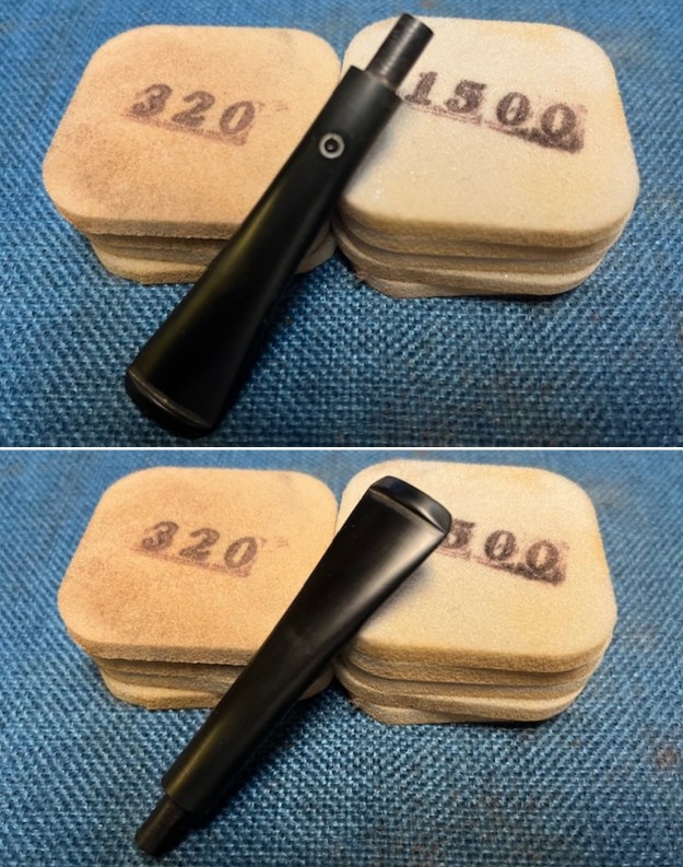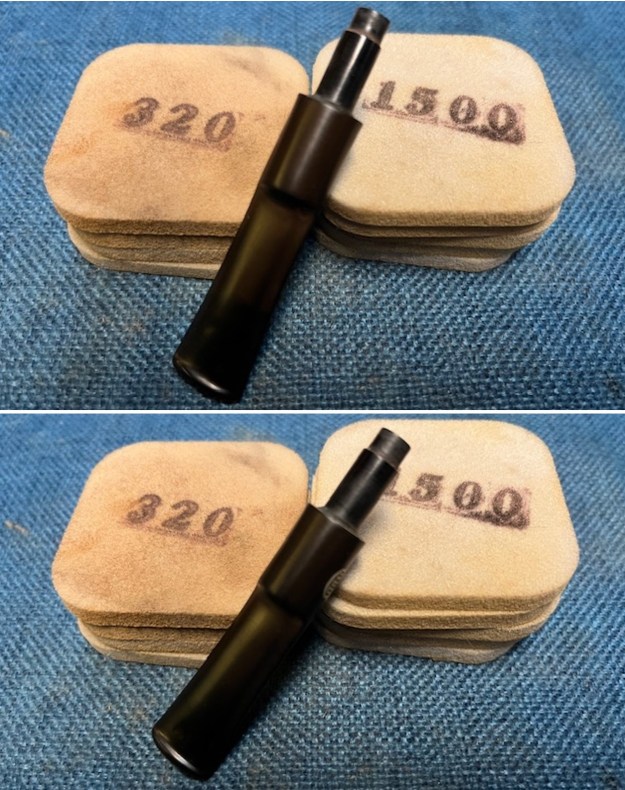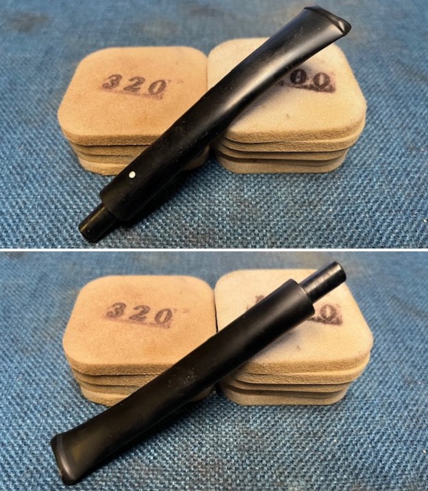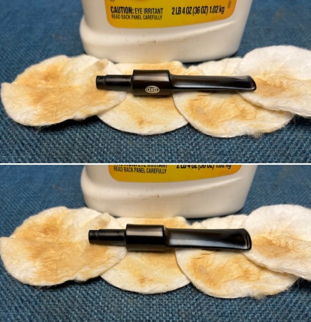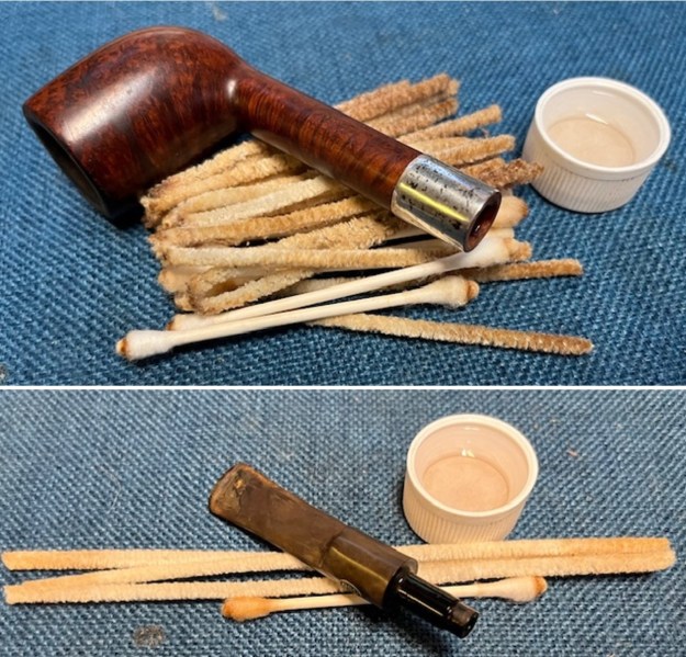 When I finished polishing the stem with the sanding pads it dawned on me that I had not cleaned the internals of the shank and stem. My routine had been broken as this restoration was spread over the better part of a week. No excuse but that is what happened. So I paused the polishing and scrubbed out the inside of the shank, mortise and the airway in both the stem and the shank. I used pipe cleaners, cotton swabs and isopropyl alcohol. It cleaned up very well.