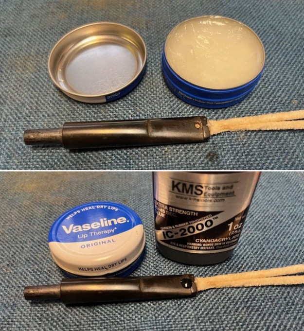 I set the bowl aside and turned my attention to the stem. The first photo shows the hairline crack on the top side of the button forward about 1/8 of an inch. I filled in the cracked area on the stem with rubberized black CA glue. I set the stem aside to let the repair cure.