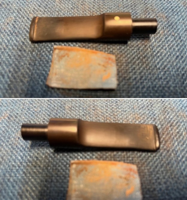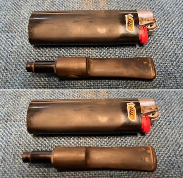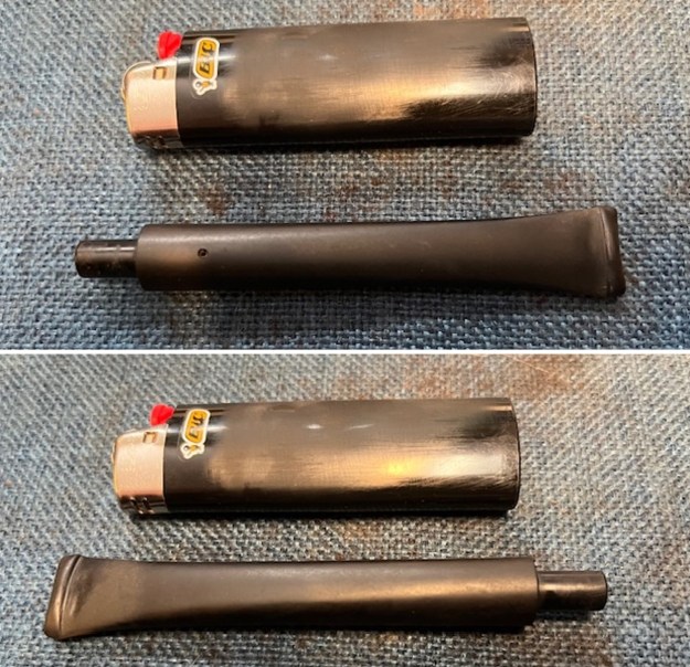 I took a photo of the rim top and bowl to show the condition of both of them. The bowl itself had been recently reamed. The rim top showed a coat of lava and some darkening around the edge. The inner edge looked rough but a cleaning would make that clear. The outer edge looked very good. The photos of the stem show light oxidation and tooth marks/chatter on both sides ahead of the button. The first photo shows a tiny hairline crack mid button and just over the edge.