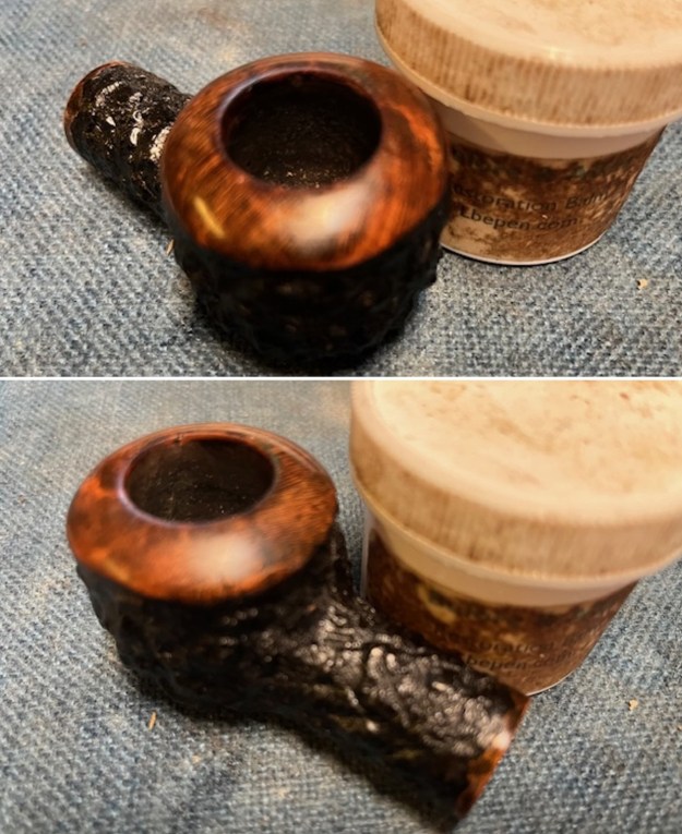 I rubbed the bowl down with Before & After Restoration Balm. It is a paste/balm that works to deep clean the finish, enliven and protect the briar. I worked it into the briar with my finger tips to make sure that it covered every square inch of the pipe. I set it aside for 10 minutes to let it do its work. I buffed it with a cotton cloth. The briar really began to have a deep shine. The photos I took of the bowl at this point mark the progress in the restoration.