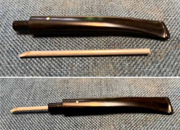 I took a photo of the stamping on the underside of the shank. The photos are blurry but you can see the shadow of the stamping. In person it is very readable. The stamp on the silver band is also very readable once the oxidation has been removed. I removed the stem from the shank and took a photo to show the proportions of the pipe.