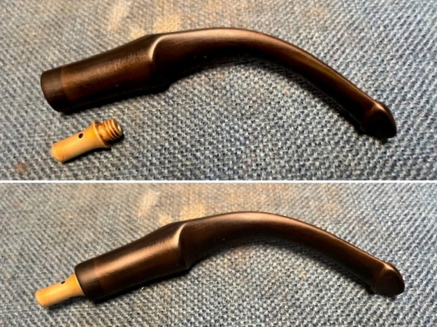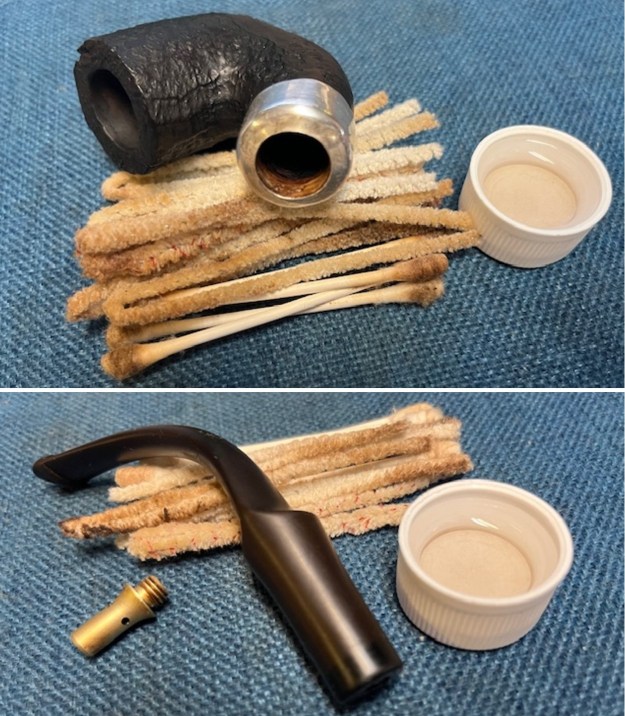 Once the pipe was reamed, cleaned and stained and the stem was deoxidized I worked on the internals – the mortise, sump and airway in the shank and airway in the stem. I cleaned out the airway to the bowl, the mortise, sump and the airway in the stem with pipe cleaners, cotton swabs and alcohol. I also worked over the aluminum chimney that screwed into the tenon on the stem.