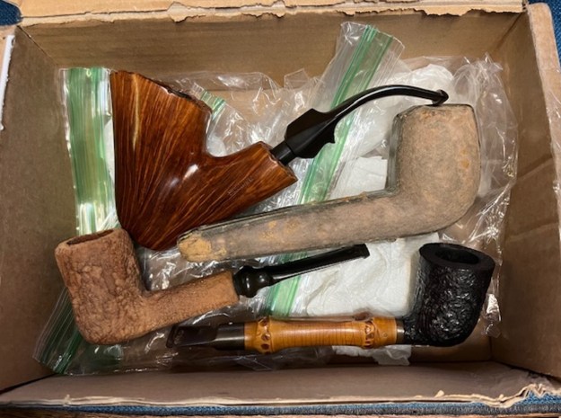 When I sent back his pipes, Sonny in Salmon Arm, BC contacted me and said he had four more he wanted me to work on. He put them in the mail and I received them on Monday this week. I took a photo of the box of four pipes once I unwrapped them. There were 4 interesting and very unique pipes – a Vauen Solitaire 148 Freehand Filter Pipe that is huge, an older case meerschaum with an overclocked stem, a Dunhill Wanghee Sandblast Dublin with a Bamboo shank and short saddle stem and finally an Anima wax drip sand blast Billiard carved by Brian McNulty. All needed varying degrees of restoration.