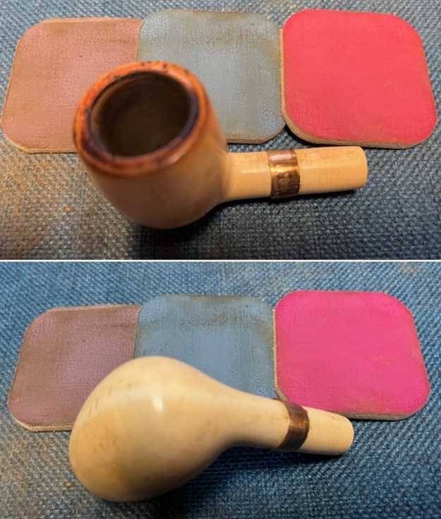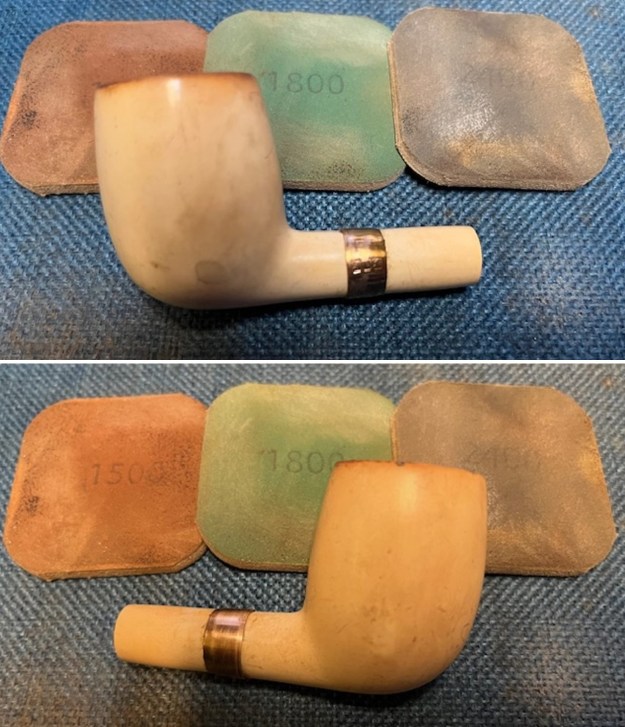 I polished the smooth rim top with micromesh sanding pads. I dry sanded it with 1500-12000 grit sanding pads and wiped the bowl down after each pad with a damp cloth. By the final pads the briar really had a shine.