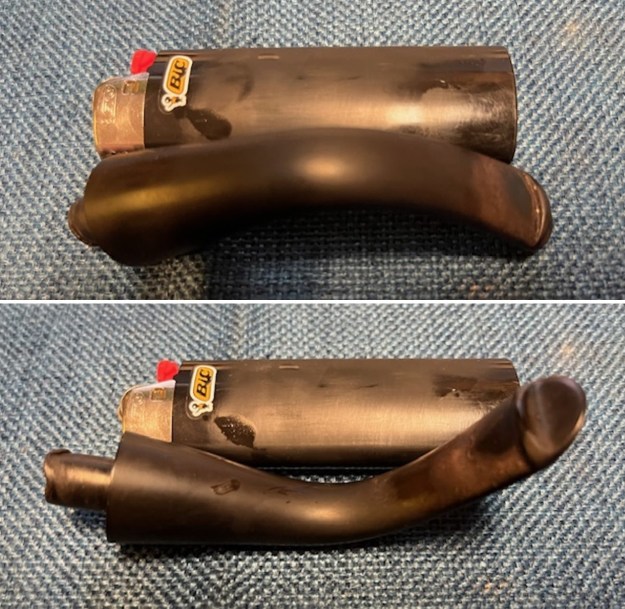 I set the bowl aside and turned my attention to the stem. I “painted” the tooth marks on both sides with the flame of a Bic lighter. I filled in the two deeper marks with black rubberized CA glue and set it aside to cure. One it had hardened I sanded the with 220 grit sandpaper and smoothed them out.