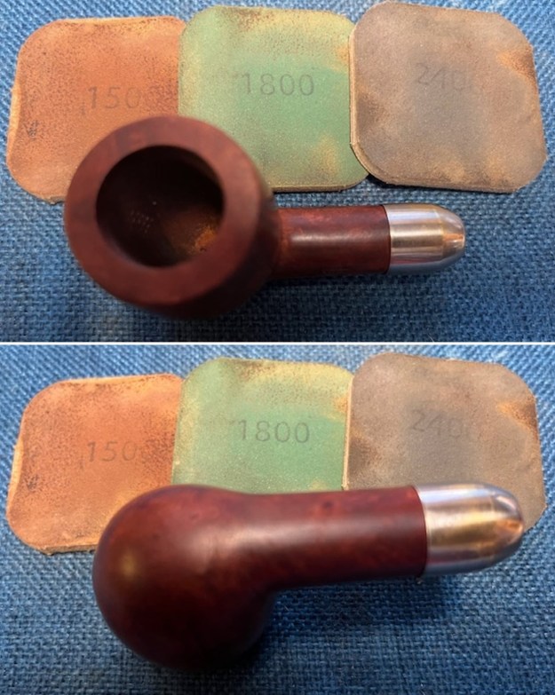 I sanded the briar with 320-3500 grit sanding pads. I dry sanded it and then wiped it down with a damp cloth after each sanding pad. The varnish finish was gone and the fills in the bowl sides were very visible.