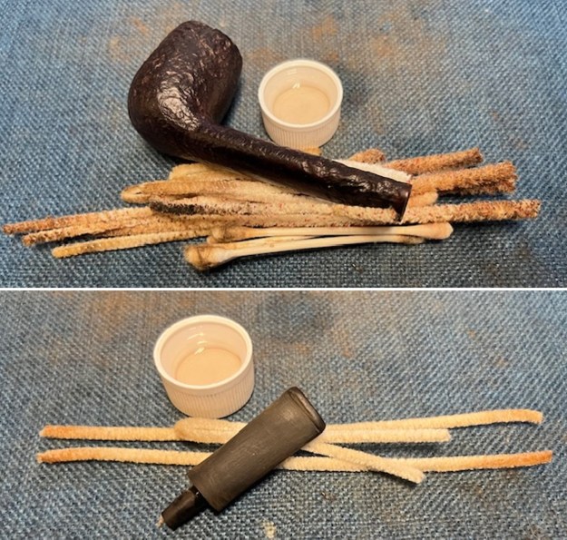 I wiped off the varnish on the bowl with acetone on a cotton pad. I was careful around the signatures and stamping on the shank side. They were almost hand etched on the twisted shank sides. I was able to remove a lot of varnish and when done it looked much better.
