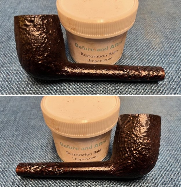 I rubbed the briar down with Before & After Restoration Balm. I worked it into the briar with my fingertips. The product works to clean, enliven and preserve the briar. I let it sit for 10 minutes then I buffed it with a cotton cloth to deepen the shine. The briar really comes alive with the balm.