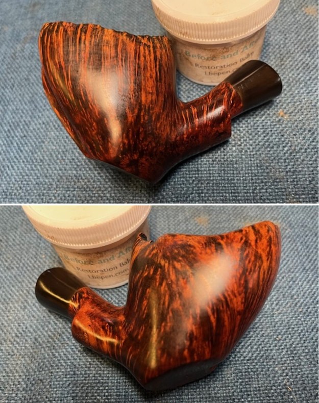 I worked some Before & After Restoration Balm into the surface of the briar with my fingertips and into the plateau rim top with a horsehair shoe brush to clean, enliven and protect it. I let the balm sit for a little while and then buffed with a cotton cloth to raise the shine. The photos show the bowl at this point in the restoration process.