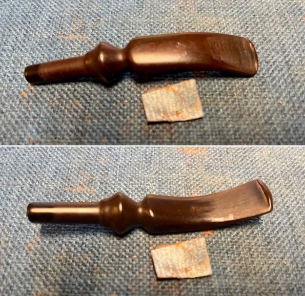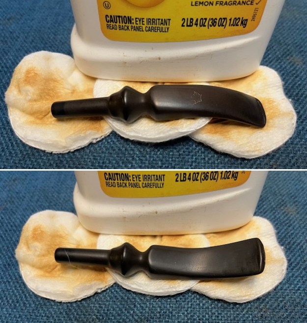 Jeff had thoroughly cleaned up the pipe. He reamed the pipe with a PipNet Pipe Reamer and cleaned up the remnants with a Savinelli Fitsall Pipe Knife. He scrubbed the bowl with undiluted Murphy’s Oil Soap with a tooth brush. He rinsed it under running warm water to remove the soap and grime. He cleaned out the inside of the shank and the airway in the stem with alcohol, cotton swabs, pipe cleaners and shank brushes. He scrubbed the exterior of the stem with Soft Scrub to remove the grime and calcification. He soaked the stem in Before & After Deoxidizer and rinsed it with warm water.