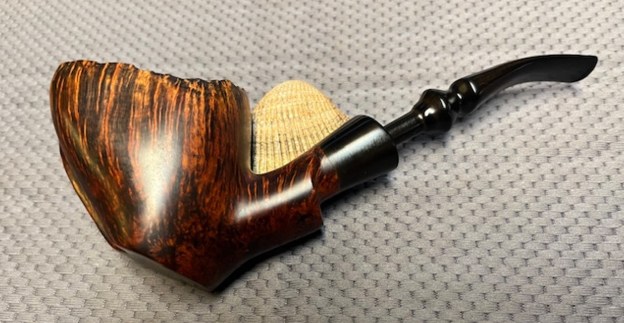 This is a beautiful Preben Holm made Ben Wade Golden Walnut Freehand with a fancy, turned, black vulcanite stem. It has a great look and feel. The shape fits well in the hand with the curve of the bowl and shank junction a perfect fit for the thumb around the bowl when held. I polished stem and the bowl with Blue Diamond polish on the buffing wheel. I gave the plateau on the rim top and shank end multiple coats of Conservator’s Wax. I gave the bowl and the stem multiple coats of carnauba wax. I buffed the pipe with a clean buffing pad to raise the shine. I hand buffed it with a microfiber cloth to deepen the shine. The pipe polished up pretty nicely. The rich combination of browns and black in the smooth finishes and the plateau areas took on life with the buffing. The rich colour of the briar works well with the polished vulcanite stem. I like the grain and finished look of this Preben Holm Ben Wade Golden Walnut pipe. Have a look at it with the photos below. The shape, finish and flow of the pipe and stem are very well done. The dimensions are Length: 7 inches, Height: 2 ½ inches, Outside diameter of the bowl: 2 wide x 2 ¼ inches long, Chamber diameter: 7/8 of an inch. The weight of the pipe is 93 grams/3.25 ounces. This pipe will be going on the Danish Pipe Makers Section of the rebornpipes store if you are interested in adding it to your collection. Thanks for reading this blog and my reflections on the pipe while I worked on it. This is an interesting estate to bring back to life.
