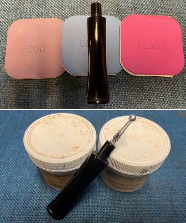 I polished the stem with micromesh sanding pads – dry sanding it with 1500-12000 grit pads. I polished it further with Before & After Pipe Stem Polish – both fine and extra fine.