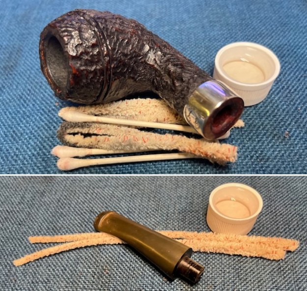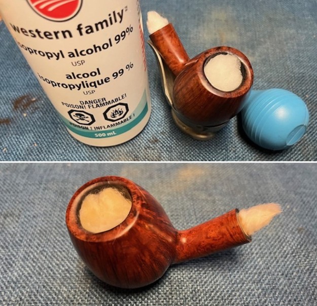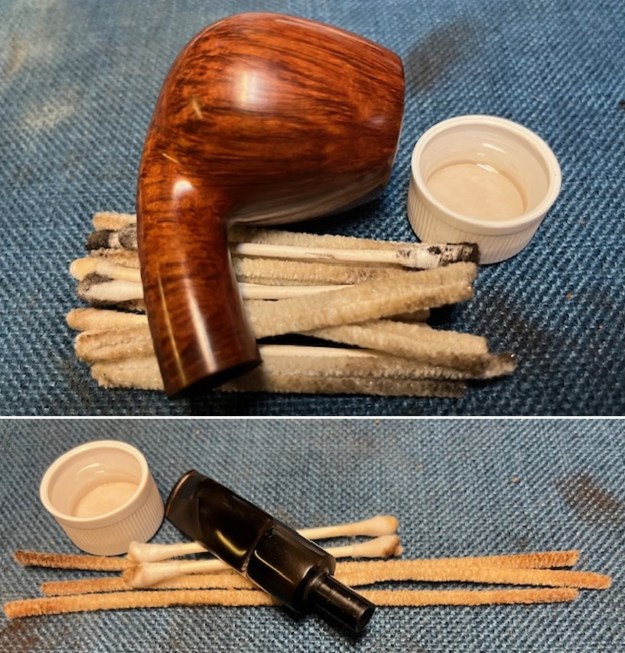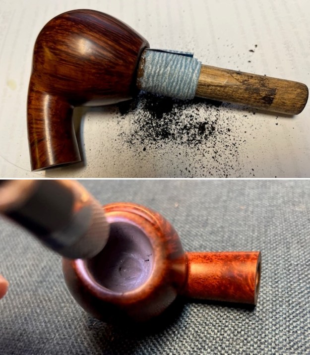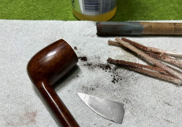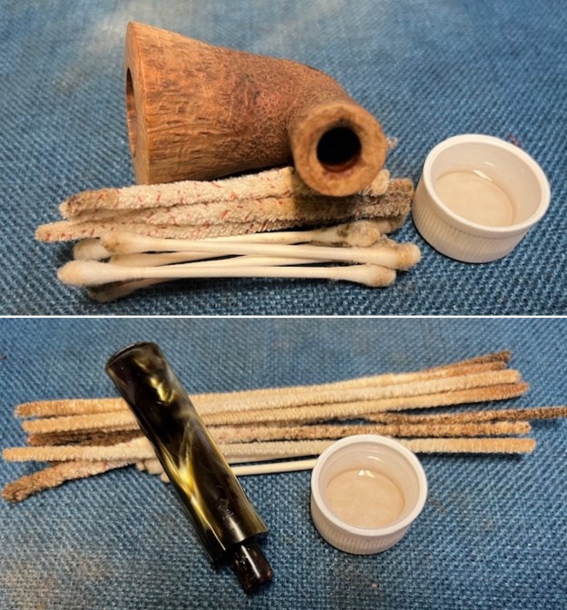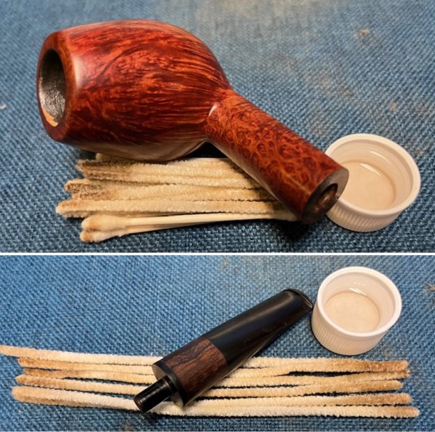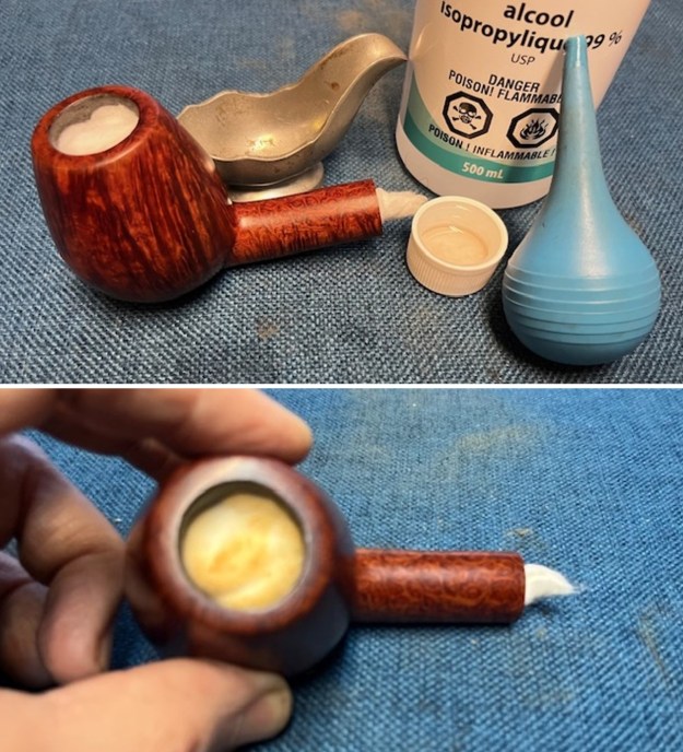 I cleaned out the stinky smelling tobacco oils and tars in the shank and the airway in the stem. I used 99% isopropyl alcohol, cotton swabs and pipe cleaners and was able to remove the debris and the stench.
