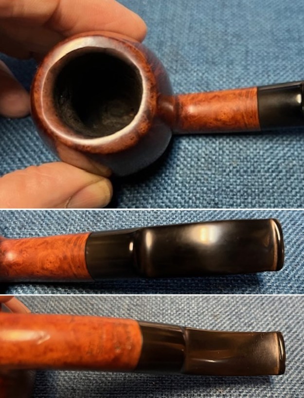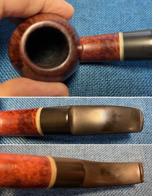 I took photos of the rim top and stem to show the general condition of the pipe. The bowl is moderately caked and the rim top and edges have lava overflowing on to them. The stem is dirty, lightly oxidized and has light tooth marks on the top and underside near the button.