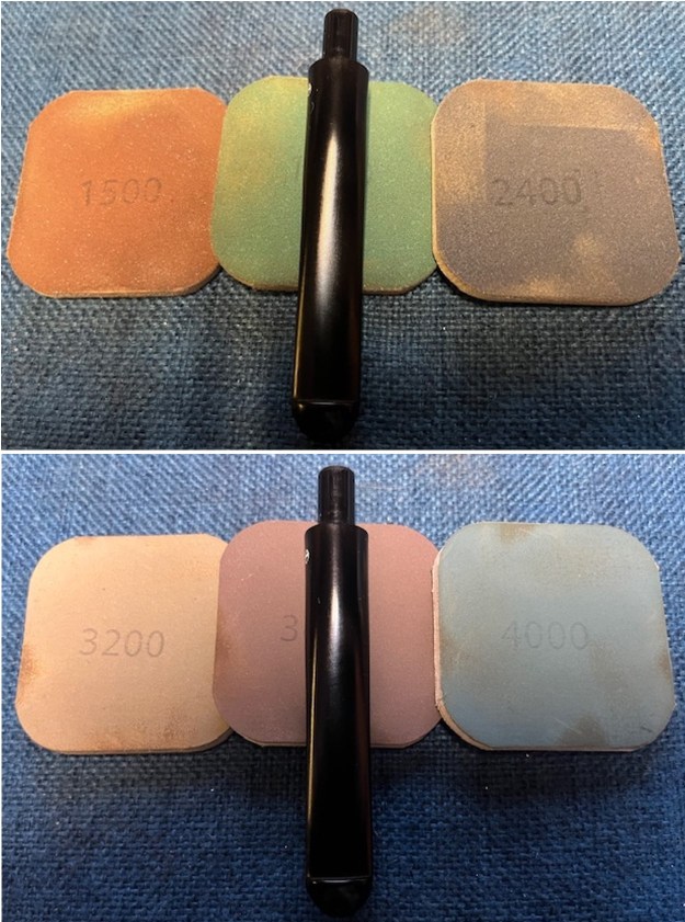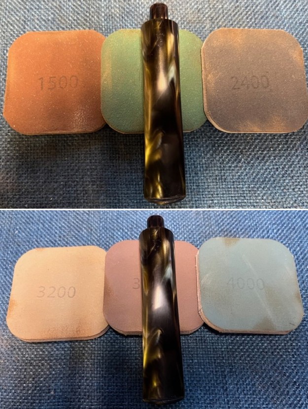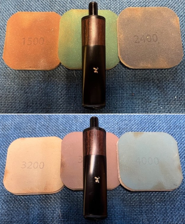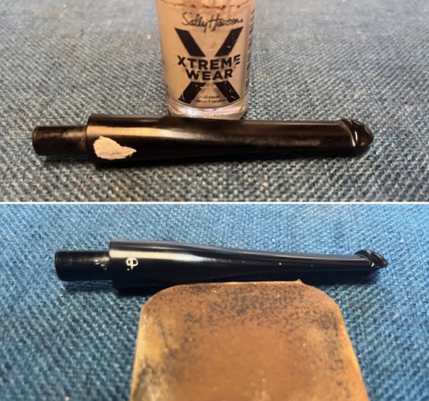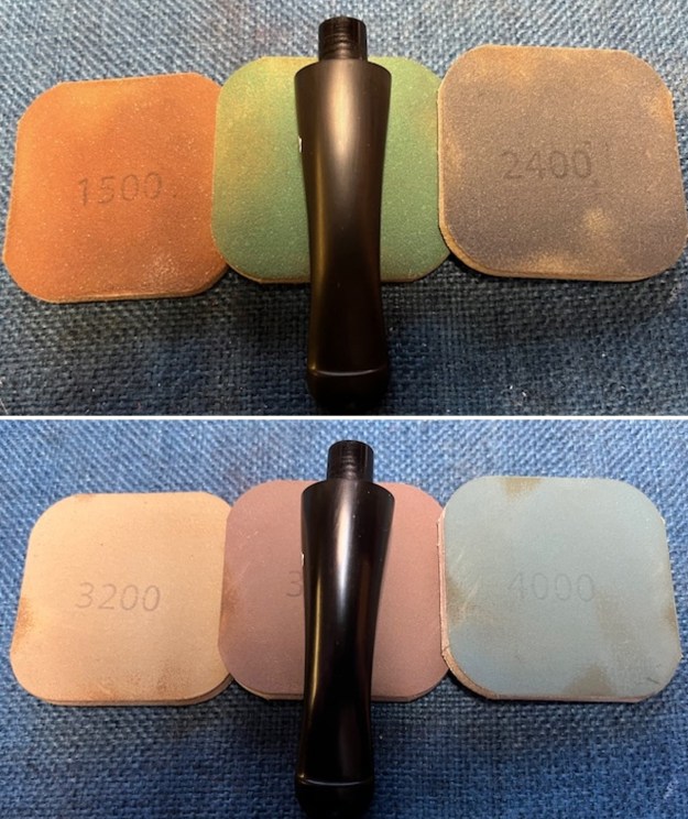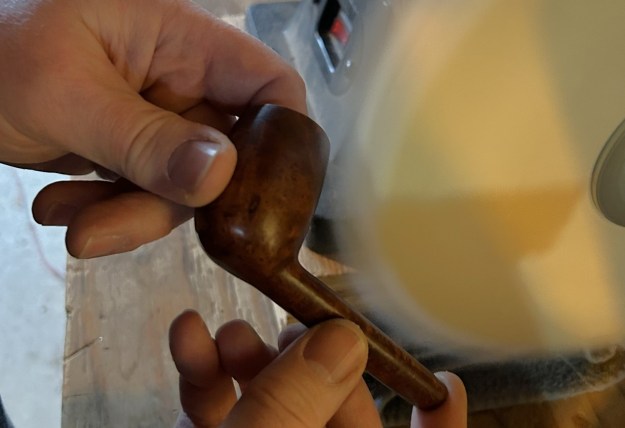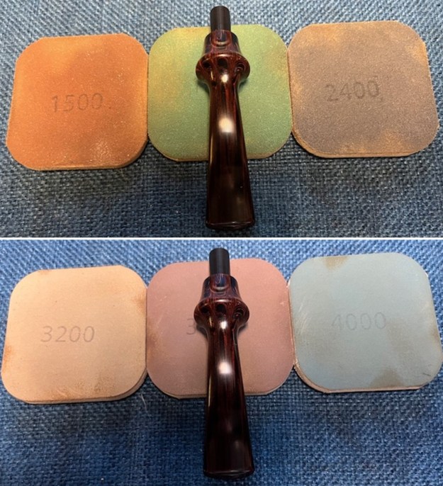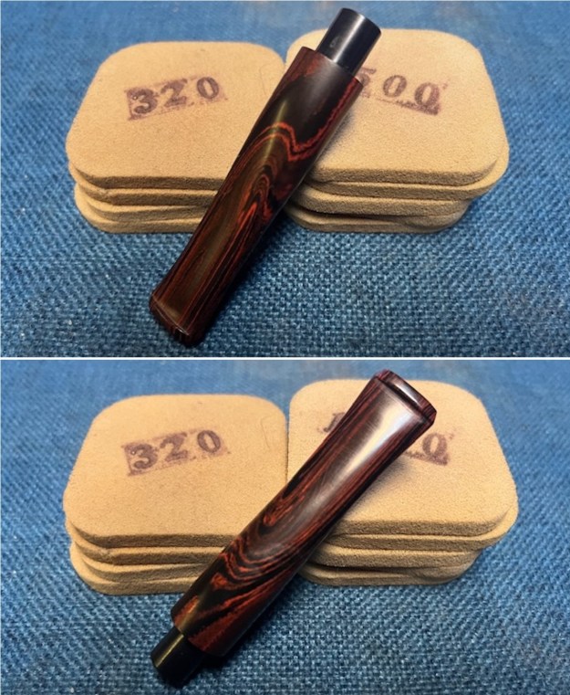 I set the bowl aside and turned to work on the stem. I sanded the stem with 320-3500 grit sanding pads. I wiped the stem down after each pad with Obsidian Oil. It really began to take on a shine.