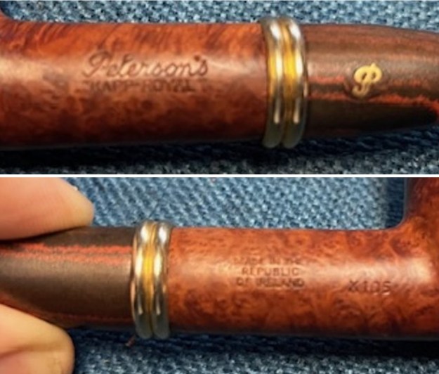 As noted above the silver is stamped Peterson’s [over] Dublin followed by Sterling [over] Silver. On the underside are three hallmark stamps – 1. Seated Hibernia (Ireland) 2. The Harp (symbol for the silver quality) 3. The upper case letter “E” for the date of the pipe. I have included the Peterson’s Hallmark chart below as it is a very helpful tool that I have used repeatedly to date my Peterson pipes.