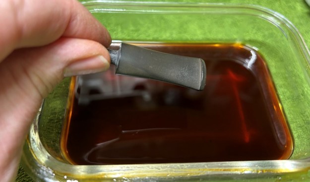 I scrubbed the exterior of the bowl with a tooth brush and undiluted Murphy’s Oil Soap. I scrubbed the inside of the bowl as well to remove more of the oils and build up there. I rinsed it off with warm running water and dried it with a soft towel. When I dried it off it was dull and a bit lifeless looking. The finish was spotty so I gave it a quick buff with a cotton cloth. It looked much better and the rim top looked clean.